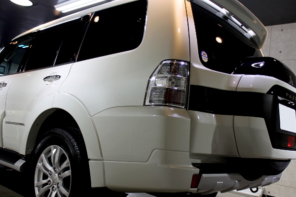 ボディーカラーはウォームホワイトパール、パジェロにぴったりな綺麗な塗装であります。